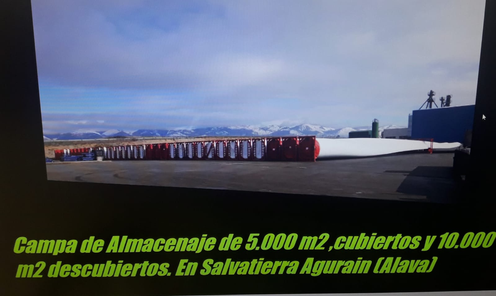 Profitant des installations du Transbiaga à Salvatierra (Álava), près de la route principale A-1, où 5 000 m² sont couverts et 10 000 m² non couverts, 36 pelles éoliennes AW66 ont été transportées et stockées tout au long du mois de janvier. 7, 64m de long et du fabricant Nordex-Acciona Windpower.
