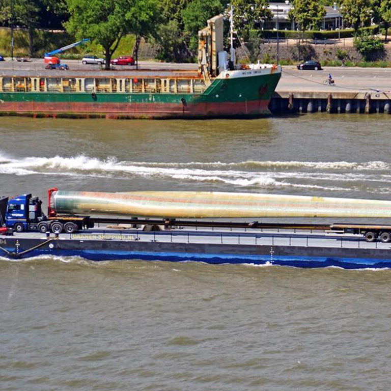 Image étonnante - les décisions de transport difficiles peuvent sembler être un art! Transport de la lame d'un moulin à vent avec une barge aux Pays-Bas. Longueur totale de la lame 55 m! c'est une maison de 18 étages!