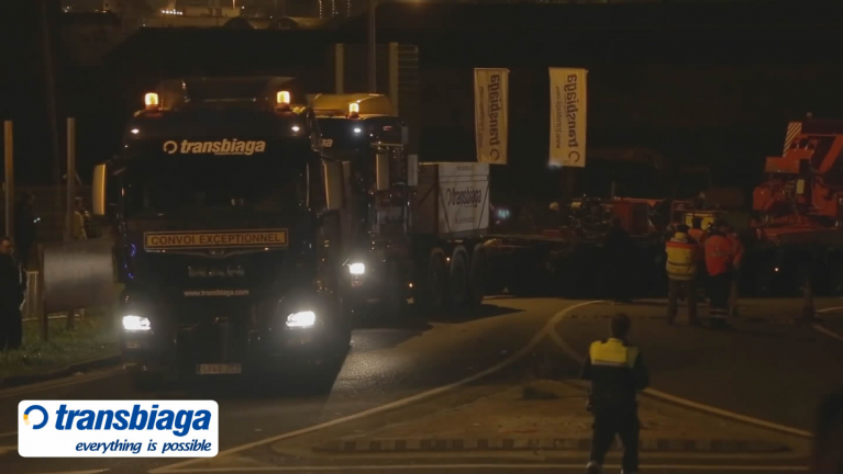 15 du novembre 2016, on a commencé avec le transport d’une Nacelle de 514tns de poids du port de Pasajes jusqu’au Sangüesa (Navarre).